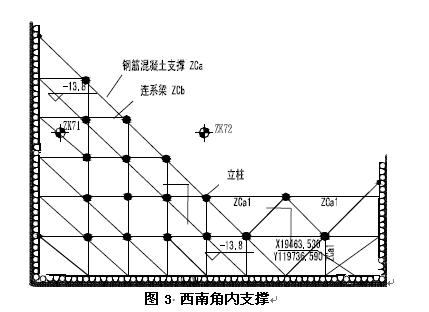 在基坑的東北角、東南角以及西南角設(shè)置有內(nèi)支撐(見圖3),內(nèi)支撐共有四道,支撐截面尺寸為1200mm×800mm與1200mm×1000mm,連系梁截面尺寸為800mm×600mm,混凝土等級(jí)均采用C25。
