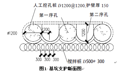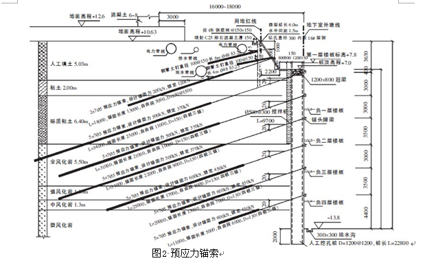 樁為圓樁與方樁(有效邊長(zhǎng)為1.2m)兩種,分一序圓樁、二序方樁施工,直徑D1200mm,樁中心距1200mm,護(hù)壁厚150mm,緊密連接形成一個(gè)連接的墻體,作為地下室外墻使用,樁頂冠梁800mm×1200mm,樁身與冠梁混凝土等級(jí)均采用C30,錨索位置設(shè)置鋼筋混凝土腰梁,錨索張拉鎖定在腰梁上。