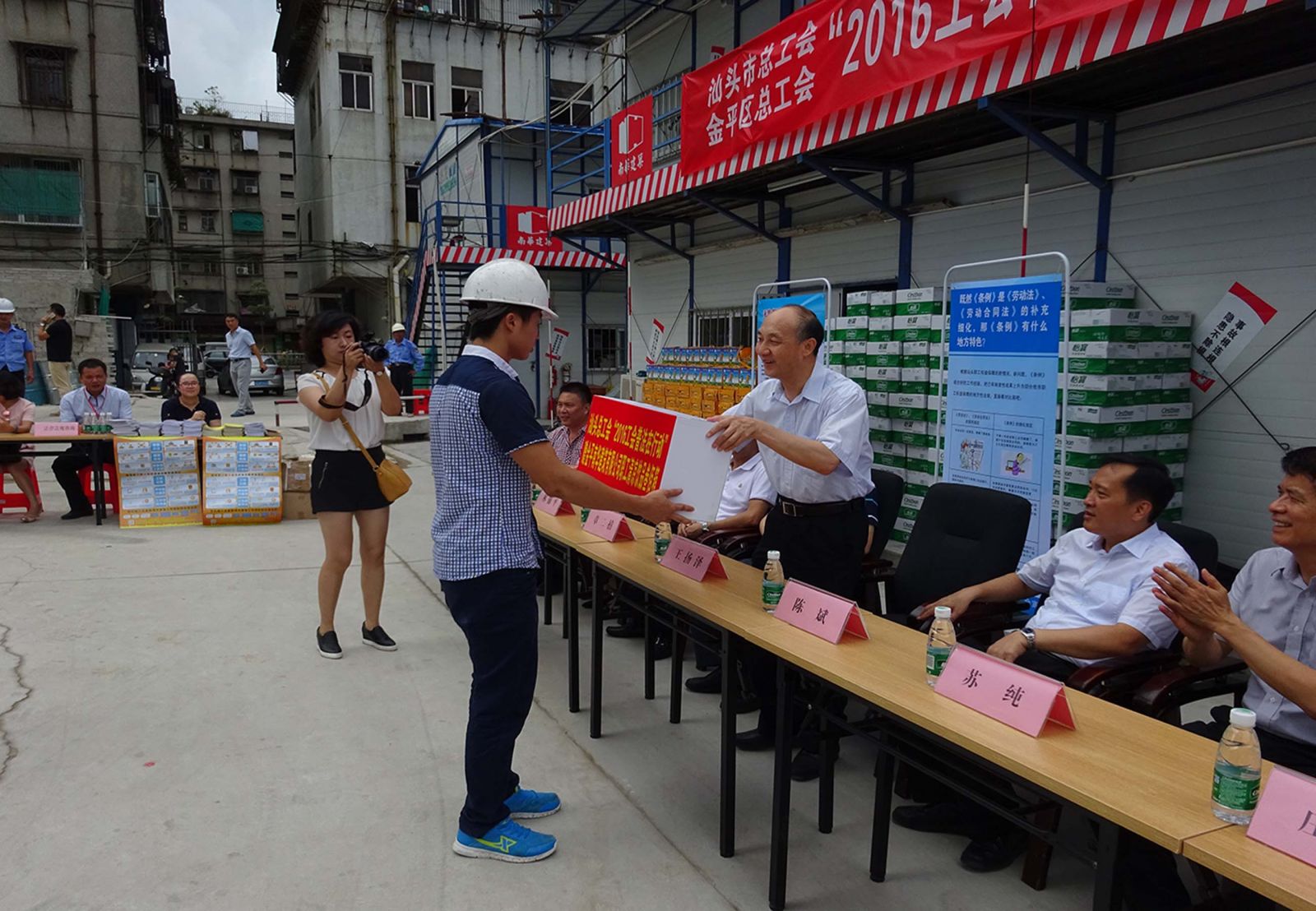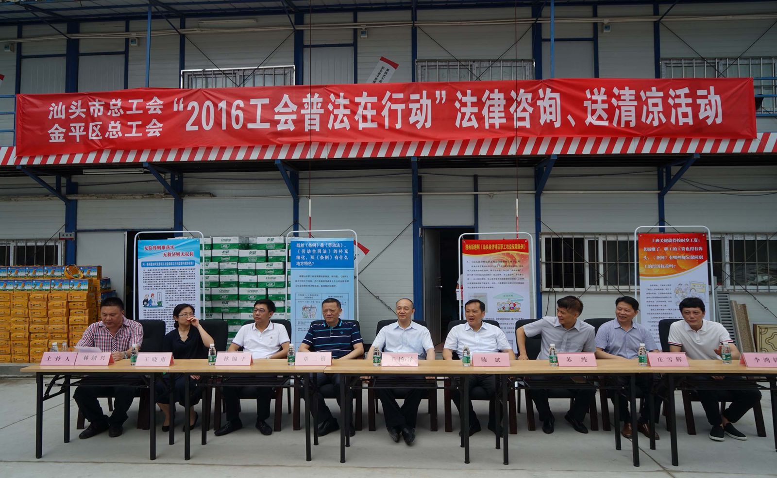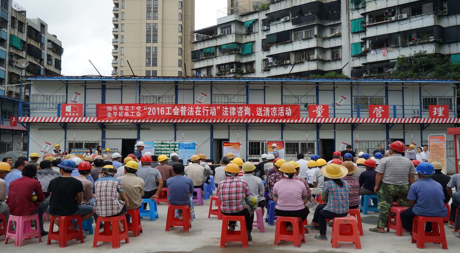 盛夏已到,高溫來襲,這給各行業(yè)作業(yè)人員帶來諸多的影響,尤其是奮戰(zhàn)在建筑施工現(xiàn)場的作業(yè)人員容易疲勞及中暑,為進(jìn)一步關(guān)心現(xiàn)場作業(yè)人員的身心健康,汕頭市總工會、金平區(qū)總工會聯(lián)合我司于6月30號在建設(shè)項目施工現(xiàn)場舉行 “2016工會普法在行動”法律咨詢、送清涼活動。