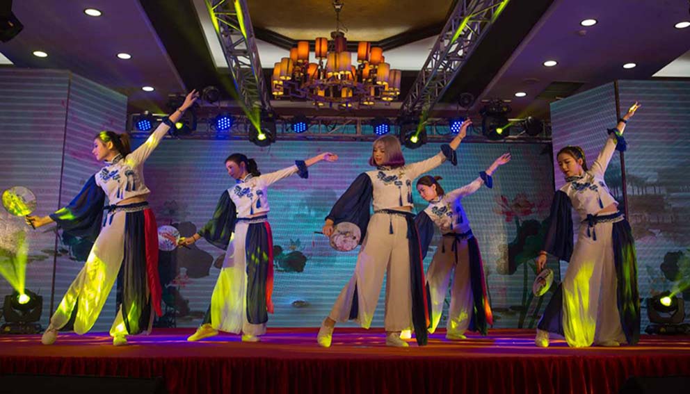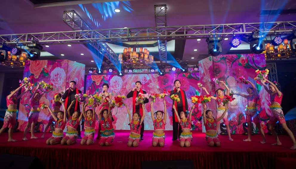 晚會現(xiàn)場賓朋滿座、掌聲熱烈、氣氛高昂,菜肴豐盛。來自各個部門的員工精心準(zhǔn)備的文藝節(jié)目,例如茶藝表演、青春舞蹈、小品表演、雙人舞伴古箏表演、小組合唱、現(xiàn)場書法表演、少兒舞蹈、歌曲合唱等精彩節(jié)目。晚會上泰國特邀嘉賓還送上精彩的舞蹈和誠摯的新年祝福。這些節(jié)目多才多藝、精彩紛呈,為新的一年添上濃濃的喜慶色彩!