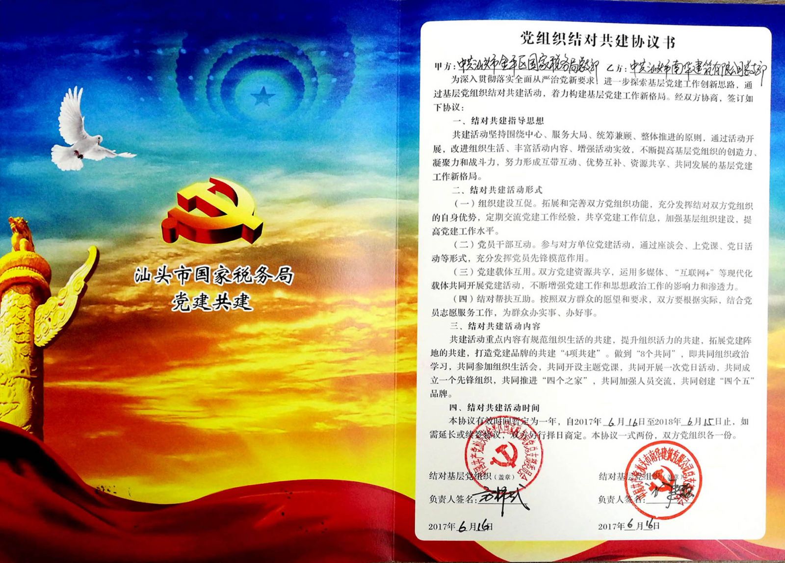金平區(qū)國家稅務局黨總支部與我司黨總支部正式簽訂結對共建協(xié)議書,并向我司贈送“黨建共建單位”稱號及一批稅收政策書籍和稅收宣傳資料。