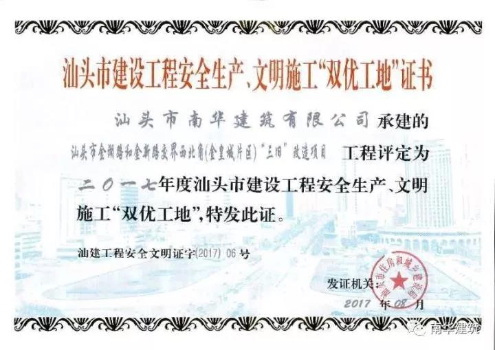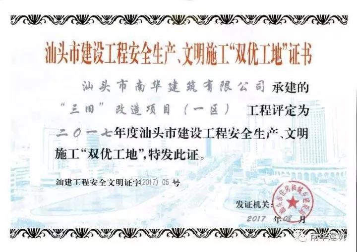 “三舊”改造項目(一區(qū))和汕頭市金湖路和金新路交界西北角(金皇城片區(qū))“三舊”改造項目順利通過驗收,并于8月份榮獲汕頭市建設(shè)工程安全生產(chǎn)、文明施工“雙優(yōu)工地”證書,這也是對公司在安全文明生產(chǎn)管理上的一種認(rèn)可及鞭策。