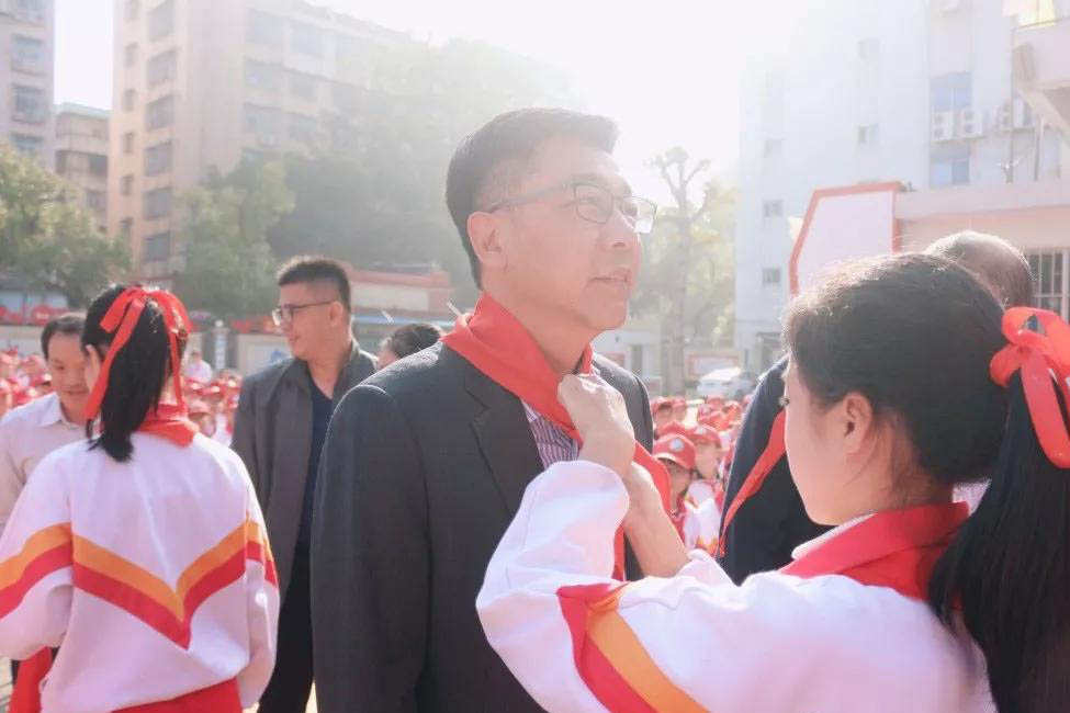 在宣布主題隊(duì)日活動(dòng)開(kāi)始時(shí),學(xué)生們?yōu)榧钨e獻(xiàn)上紅領(lǐng)巾,并出隊(duì)旗、唱隊(duì)歌。