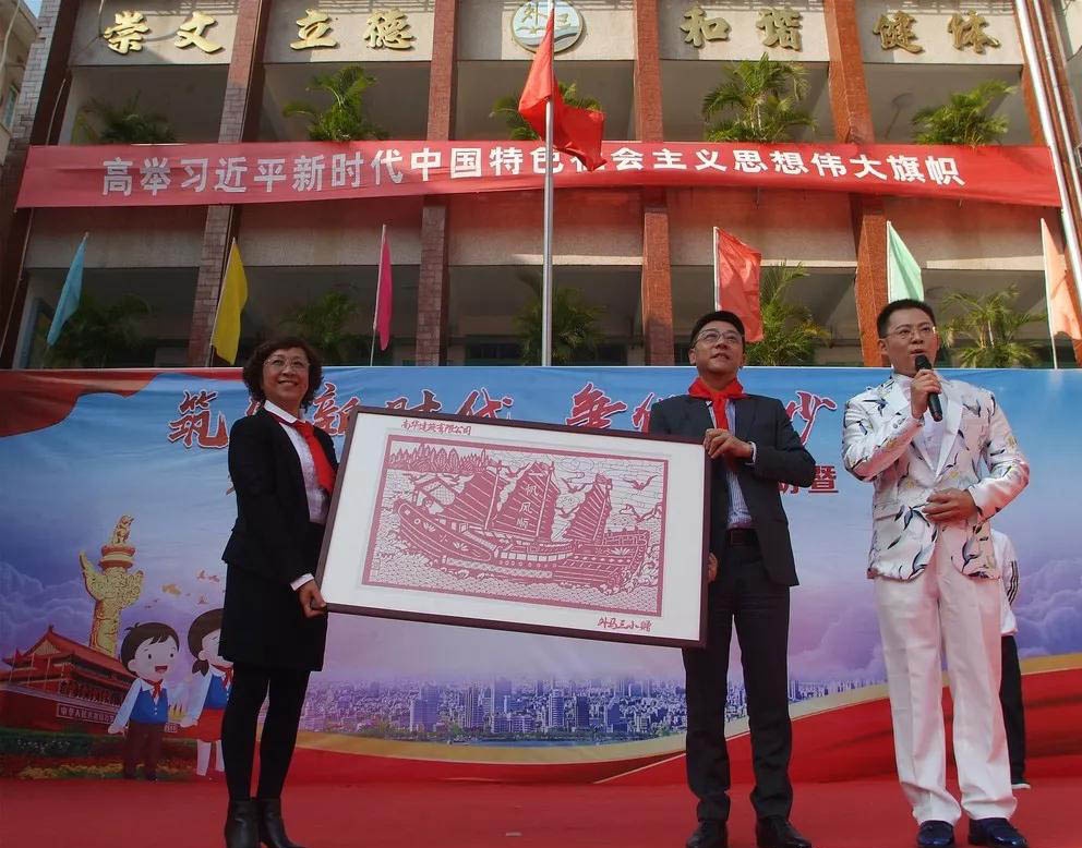 學(xué)校為了表達(dá)對(duì)林董事長(zhǎng)誠(chéng)摯的謝意,向我司贈(zèng)送剪紙作品《一帆風(fēng)順》,這一幅剪紙是由汕頭市非遺傳承人陳小燕老師親自設(shè)計(jì)創(chuàng)作的,馮校長(zhǎng)代表學(xué)校贈(zèng)送作品,表達(dá)對(duì)南華公司的美好祝愿。