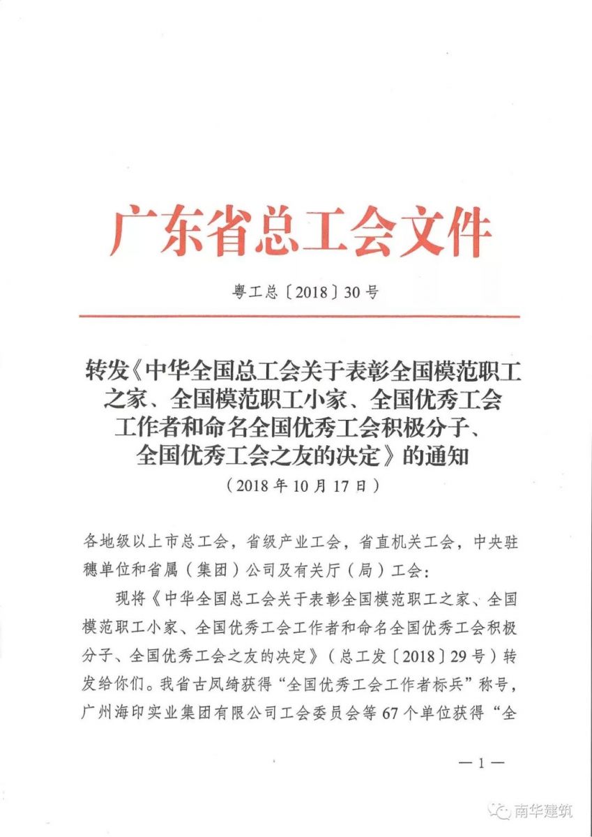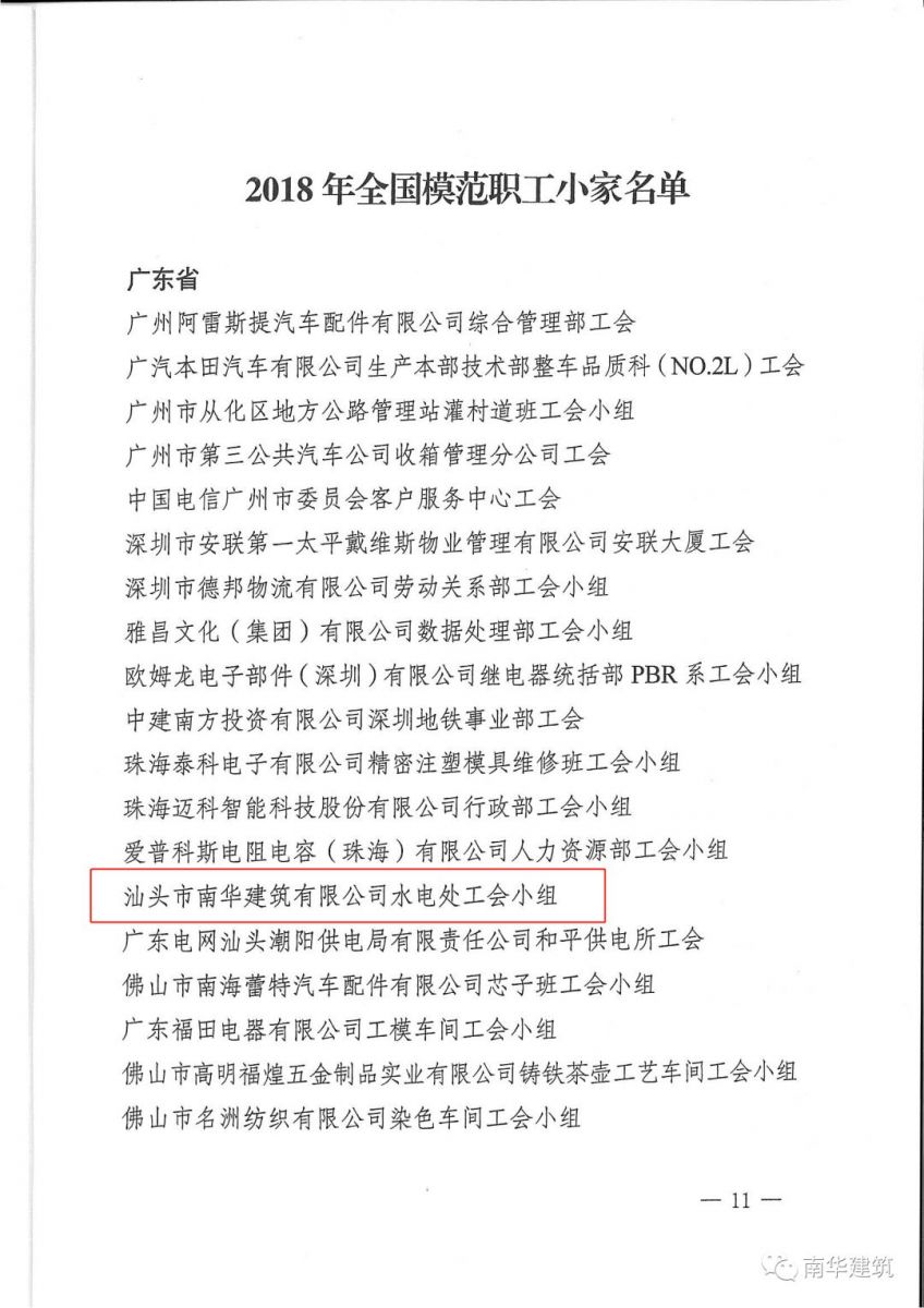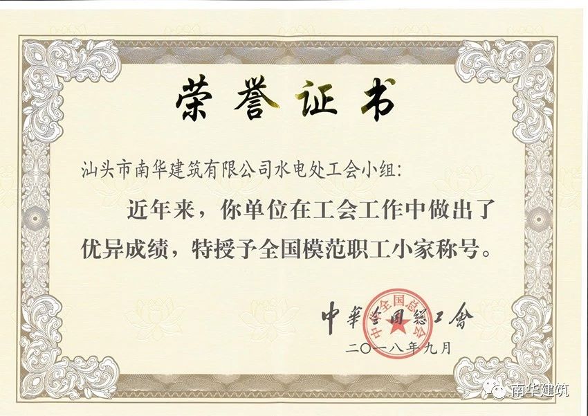喜訊!汕頭市南華建筑有限公司水電處榮獲“全國模范職工小家”稱號!