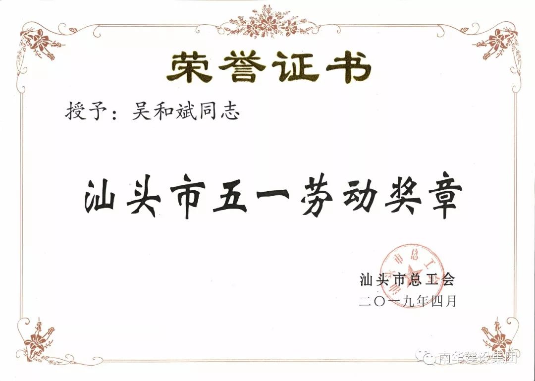 勞動創(chuàng)造價值,勞動創(chuàng)造美好,在“五一國際勞動節(jié)”這個屬于我們勞動者的歡樂節(jié)日到來之際,吳和斌同志作為集團公司勞動者的代表,被授予“汕頭市五一勞動獎?wù)?rdquo;。