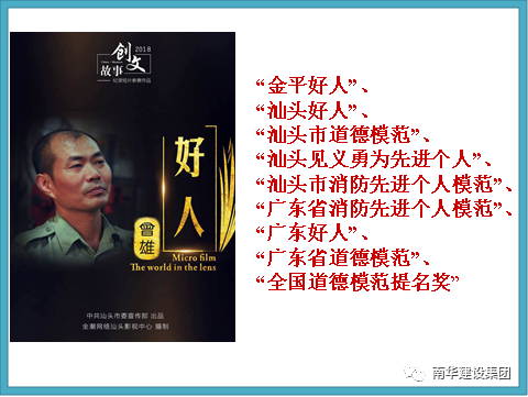 曾雄先生多年來堅持見義勇為、助人為樂,其事跡廣為傳頌,先后獲得“汕頭好人”、“廣東好人”、“廣東省道德模范”、“全國道德模范提名獎”等。