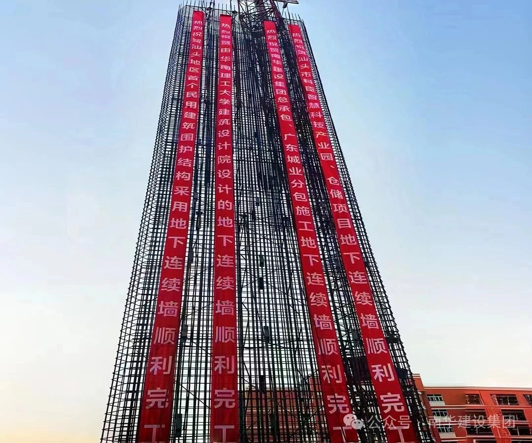 由集團公司承建的“科臣智慧科技產(chǎn)業(yè)園倉儲項目”,圍護結(jié)構(gòu)采用鋼筋混凝土地下連續(xù)墻+內(nèi)支撐體系,實現(xiàn)“兩墻合一”,相對于傳統(tǒng)的先做支護再做地下室結(jié)構(gòu)外墻的做法,可縮短工期,降低造價。該工程位于汕頭市泰山南路東側(cè),總建筑面積104046.20m²,基坑開挖深度約9.2m,連續(xù)墻墻身平均長度38米,墻身底部伸入軟土層(地下土體結(jié)構(gòu)第6層)2米,連續(xù)墻切斷第4層(砂土層)中的承壓水,防止基坑開挖過程中出現(xiàn)坑底突涌,由于軟土層滲透系數(shù)小可以充當(dāng)不透水層,連續(xù)墻和軟土層形成近似封閉的立體隔水空間,提高了建筑物永久地下室的防水性能,并保證了基坑工程開完過程的周邊環(huán)境水土平衡和穩(wěn)定性。連續(xù)墻在汕頭地區(qū)的應(yīng)用案例較少,同樣的地質(zhì)條件可以借鑒的工程項目相對稀缺,因此需不斷在實踐中摸索與改進相關(guān)施工工藝。