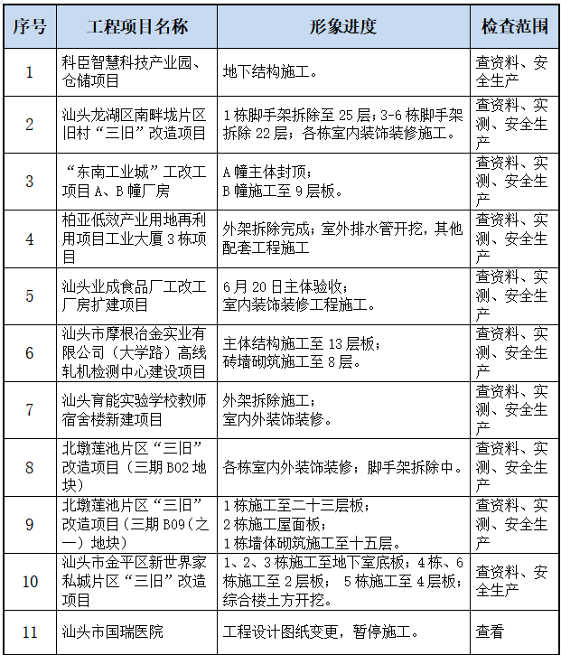 一、在建項(xiàng)目及其進(jìn)度 以下11個(gè)項(xiàng)目工程接受本次檢查。